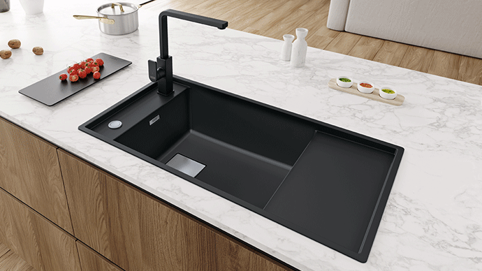 A Fragranit kollekció új színe rendkívül kifinomult és meghatározó. Mélyfekete, matt formulával és sima, nem porózus felülettel. Fekete matt, amely tisztaságot idéz, és elegáns dizájnt kölcsönöz minden környezetnek. Élénk tónus, amely teljes mértékben képes fokozni a kifinomult Franke dizájnt. A túlfolyó, távirányító, lefolyófedél most már fekete színben is kapható, hogy illeszkedjen a Black Matt mosogatóinkhoz és csapjainkhoz, és homogén színű egységet képezzen. -