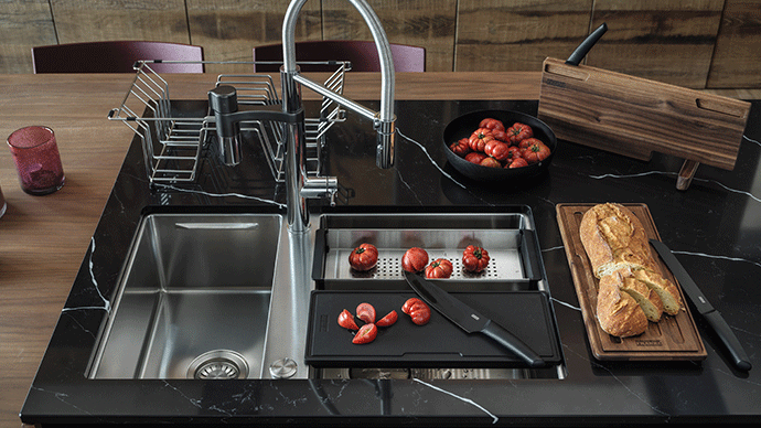 A modern mosogatót kifinomult részletek jellemzik, amelyek megkönnyítik a konyhai munkát. A praktikus alapvető kellékek mellett exkluzív kiegészítők is vannak, amelyek a mosogatót multifunkcionális munkafelületté alakítják. A legfontosabb az innovatív Franke „PUSH-PULL” távirányító a leeresztő szelep nyitásához/zárásához. Intelligens rendszer: több kényelem, kevesebb munka.
