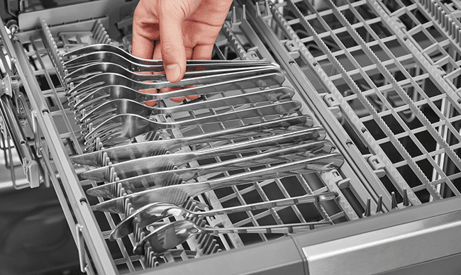 Új evőeszköz-kosarunk flexibilisebb és biztonságosabb, mint valaha. Amellett, hogy lehetővé teszi a fél kosár elcsúszását jobbra vagy balra, hogy további teret szabadítson fel a középső kosárban elhelyezett nagyobb edények számára, középső része lesüllyesztethető, hogy abba kisebb edények, csészék is beleférjenek.